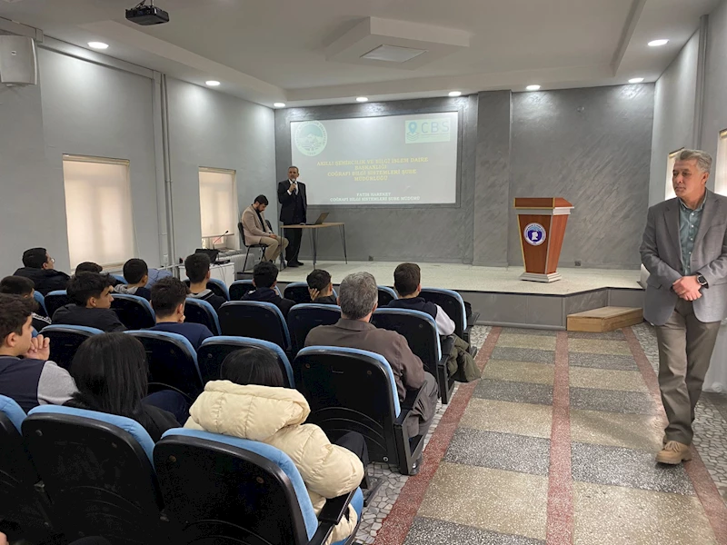 Mimar Sinan Mesleki ve Teknik Anadolu Lisesi Konferans Salonu’nda düzenlenen Coğrafi Bilgi Sistemleri ve Projeler Semineri’nde Kayseri Büyükşehir Belediyesi Akıllı Şehircilik ve Bilgi İşlem Daire Başkanlığı Coğrafi Bilgi Sistemleri Şube Müdürü Fatih Hareket ve Harita Mühendisi Yusuf Taşkesen tarafından Coğrafi Bilgi Sistemleri ‘CBS’ ile ilgili sunumlar yapıldı.