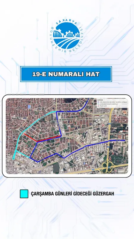 Yapılan açıklamaya göre, 17 Eylül Çarşamba gününden itibaren, Erenler'de Nilüfer ve 1139 No’lu Caddeler üzerinde kurulacak Erenler Çarşamba Kumaş Pazarı nedeniyle 19-E hattında yalnızca çarşamba günleri geçerli olmak üzere güzergâh değişikliği uygulanacak.