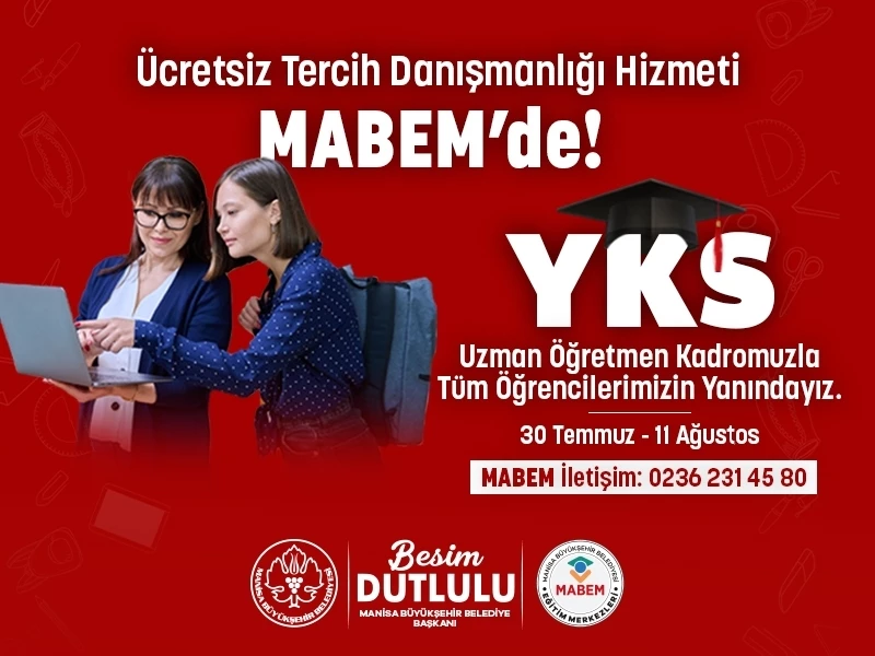 Manisa Büyükşehir Belediyesi, LGS tercih döneminde olduğu gibi üniversite adaylarını da yalnız bırakmıyor. Yükseköğretim Kurumları Sınavı (YKS) tercih döneminde, 17 ilçede hizmet veren Manisa Büyükşehir Belediyesi Eğitim Merkezleri (MABEM) aracılığıyla öğrencilere ücretsiz tercih danışmanlığı hizmeti sunuluyor.