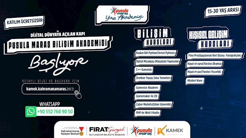 Büyükşehir Belediyesi, 15 – 30 yaş aralığındaki gençlere yönelik “Pusula Maraş Yaz Akademisi” düzenleyecek. Ücretsiz olarak düzenlenecek bilişim ve kişisel gelişim kurslarına Büyükşehir’in internet adresinden çevrimiçi başvuru yapılabiliyor.