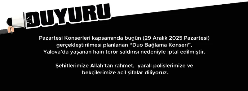 Çanakkale Belediyesi tarafından düzenlenen Pazartesi Konserleri kapsamında, 29 Aralık 2025 Pazartesi günü gerçekleştirilmesi planlanan "Duo Bağlama Konseri" iptal edildi. İptal kararının, Yalova'da meydana gelen terör saldırısı nedeniyle alındığı açıklandı.