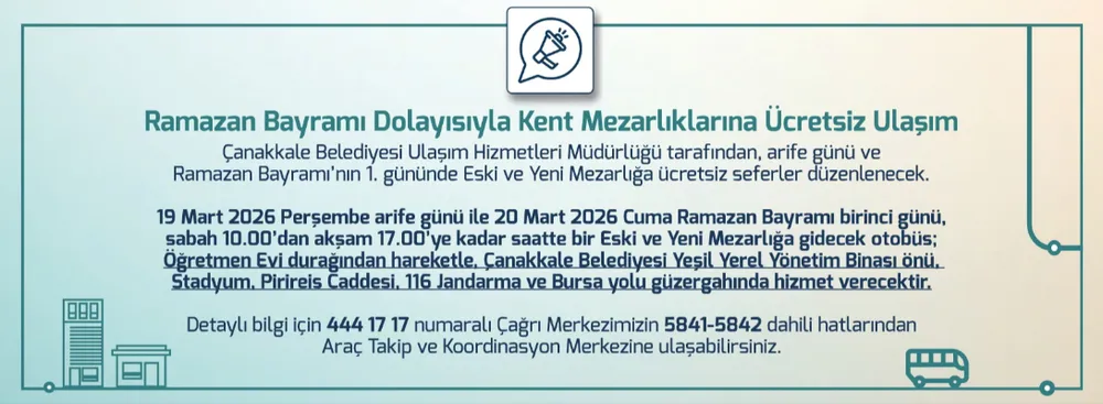 Çanakkale Belediyesi Ulaşım Hizmetleri Müdürlüğü, Ramazan Bayramı dolayısıyla ulaşım kolaylığı sağlamak amacıyla ücretsiz servis seferleri düzenleyeceğini duyurdu. Arife günü ve bayramın birinci gününde, Eski ve Yeni Mezarlık'a gidecek vatandaşlar için özel hat oluşturuldu.