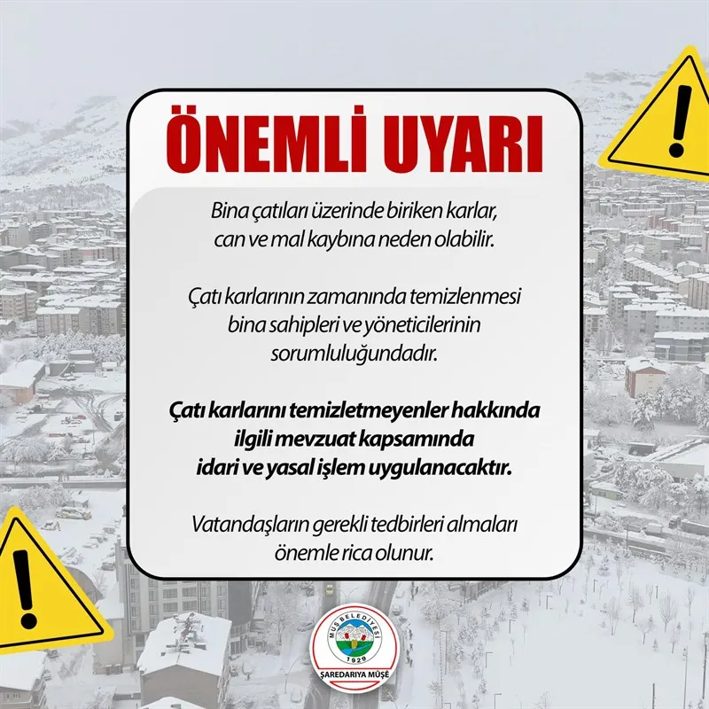 Çatı karlarının zamanında ve güvenli bir şekilde temizlenmesi sorumluluğunun, bina sahipleri ve yöneticilerine ait olduğu vurgulandı. İlgili mevzuat gereği bu görevin yerine getirilmesi zorunlu tutuluyor.