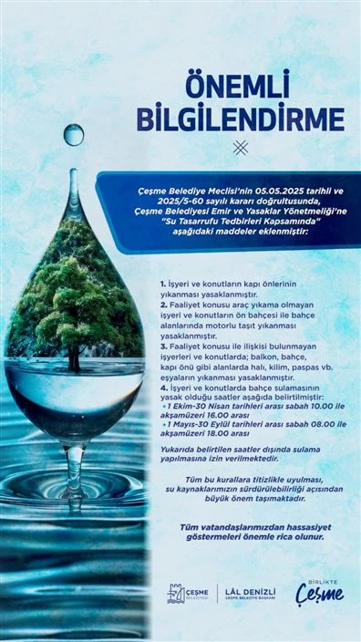 “Bu kapsamda; işyeri ve konutların kapı önlerinin yıkanması, halı-kilim gibi eşyaların dış mekânda yıkanması ve araç yıkama faaliyeti bulunmayan yerlerde taşıtların yıkanması yasaktır. Bahçe sulamaları ise yıl boyunca saat sınırlamasına tabidir. Lütfen sosyal medya hesaplarımızdan bu saat aralıklarını dikkatle takip ediniz ve sulamayı sadece belirtilen saatlerde yapınız. Bu kurallar, Çeşmemize ve geleceğimize göstereceğimiz bir dayanışma çağrısıdır. Çocuklarımızın geleceği için bugün hep birlikte bu kararlara uymalıyız. Hepinize duyarlılığınız için şimdiden teşekkür ediyorum.”