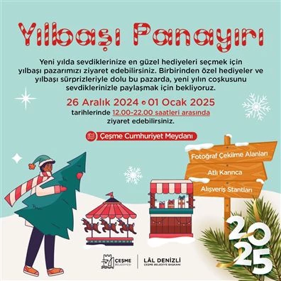Çeşme Belediyesi, 26 Aralık 2024 – 1 Ocak 2025 tarihleri arasında Cumhuriyet Meydanı’nı yeni yıl ruhuyla dolduracak Yılbaşı Panayırı’na ev sahipliği yapıyor. Her gün saat 12.00 ile 22.00 arasında açık olacak panayır, 7’den 70’e herkese keyifli ve unutulmaz anlar sunmayı hedefliyor.