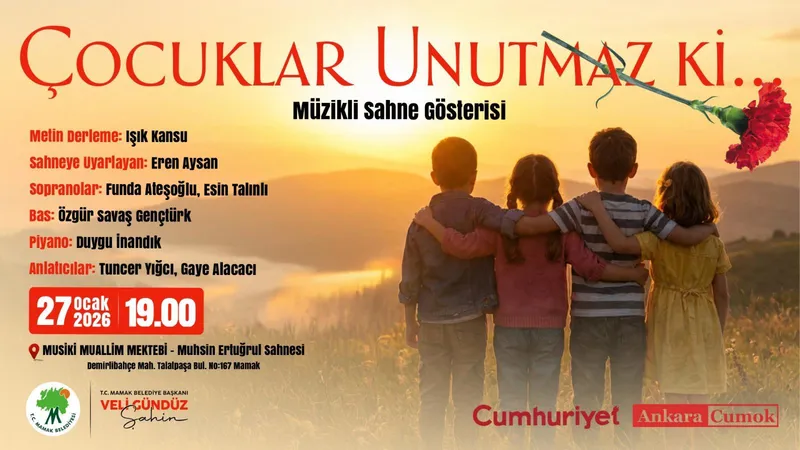 Mamak Belediyesi, Cumhuriyet gazetesi ve gazete okurlarının oluşturduğu gönüllülük hareketi CUMOK iş birliğiyle hazırlanan "Çocuklar Unutmaz ki" müzikli sahne gösterisi, 27 Ocak Salı günü saat 19.00'da Musiki Muallim Mektebi Muhsin Ertuğrul Sahnesi'nde izleyiciyle buluşacak.