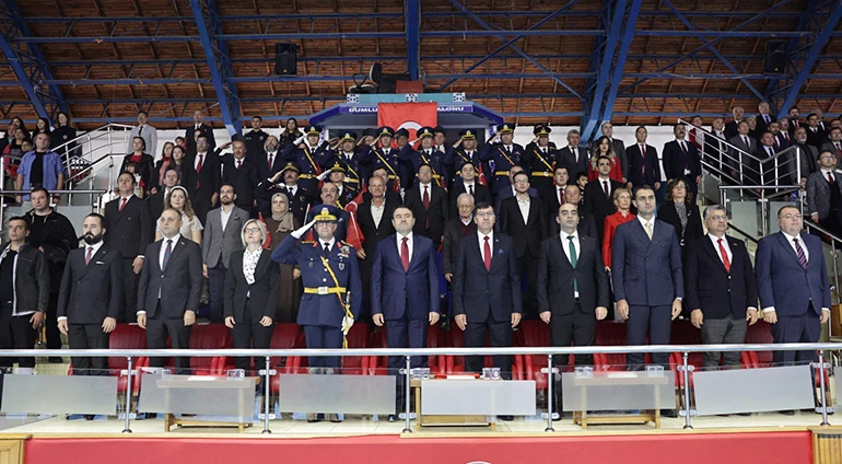 Dumlupınar Spor Salonu’ndaki kutlama töreni, Kütahya Valisi Musa Işın, Kütahya Hava Er Eğitim Tugay ve Garnizon Komutanı Tuğgeneral Mustafa Baş ve Kütahya Belediye Başkanımız Eyüp Kahveci’nin halkı selamlamasıyla başladı.