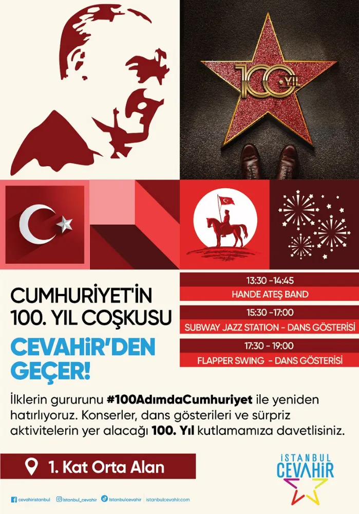 Tarihle bağ kurmak isteyenlere görsel bir şölen sunacak olan ‘100 Adımda Cumhuriyet' projesi; dönemdeki önemli olayları, bu yıldızlar aracılığıyla her adımda yeniden canlandıracak. İstanbul Cevahir ev sahipliğinde gerçekleşecek olan ve Cumhuriyet’in 100. Yıl dönümü ’nün coşkuyla kutlanacağı proje, 29 Ekim Pazar günü; Hande Ateş Band, DJ Gösterisi, Subway Jazz Statıon ve Flapper Swıng Dans Gösterisi ile sona erecek.
