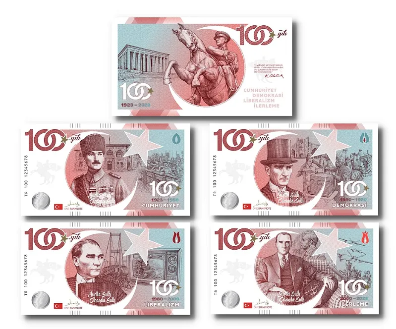 Türkiye Cumhuriyeti'nin 100. yıl kutlamaları, benzersiz bir “hatıra” ile taçlanıyor. İlhamını Türkiye’nin kuruluş mirası ve asırlık başarı serüveninden alan bir hatıra banknot koleksiyonu hazırlandı. Koleksiyonun içeriğindeki banknotlar, Türk ulusunun cumhuriyetle geçen 100 yıllık yükseliş hikayesini, “cumhuriyet”, “demokrasi”, “liberalizm” ve “ilerleme” şeklinde başlıklandırılan dört ayrı dönemde ele alarak görselleştiriyor. 100 yıllık Cumhuriyet tarihinin dönüm noktalarını sanatsal ifadelerle bir araya gertiren bu özel banknotlar, asırlık mirasa duyulan gururun gelecek nesillere taşınmasına vesile olacak. Koleksiyon, ayrıca, Cumhuriyet’in 100. yılına özel, özgün ve prestijli bir hediye arayanlar için mükemmel bir seçenek niteliğinde.