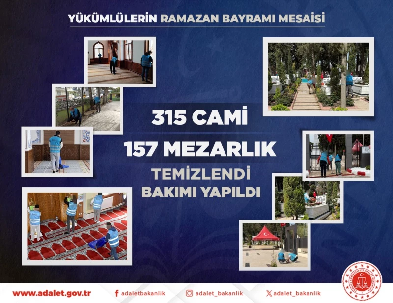 Adalet Bakanlığınca denetimli serbestlik tedbiri altında bulunan yükümlüler kamuya yararlı işler kapsamında Ramazan Bayramı öncesinde 315 cami ile 157 mezarlıkta temizlik ve bakım çalışması yaptı.