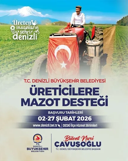 Denizli Büyükşehir Belediyesi, "Üreticilere Mazot Desteği" projesiyle üretimin sürekliliğini sağlamayı ve çiftçilerin üretim maliyetlerini düşürerek yerel ekonomiye katkı sunmayı hedefliyor. İl sınırları içerisinde ikamet eden ve üretim yapan çiftçiler, başvurularını 2 Şubat-27 Şubat 2026 tarihleri arasında yapabilecek. Başvurular, online platform veya ilçelerdeki DESKİ İlçe Hizmet Birimleri aracılığıyla kabul edilecek.