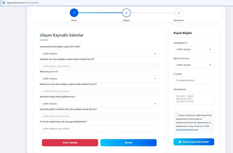 Denizli Büyükşehir Belediyesi’nin güncellediği bu hesaplama aracı, kullanıcıların yaşam tarzlarını analiz ederek karbon salımlarını hesaplamalarına yardımcı oluyor. Ulaşım, enerji tüketimi ve alışveriş gibi günlük alışkanlıkların çevreye etkisini ölçen araç, bireylere karbon salımını azaltmak için pratik öneriler sunuyor. Daha az enerji tüketimi, toplu taşıma kullanımı ve sürdürülebilir ürün tercihleri gibi önerilerle iklim dostu bir yaşam teşvik ediliyor. Ayrıca uygulama, daha çevre dostu seçimler yapmaları için kullanıcılara öneriler sunuyor.