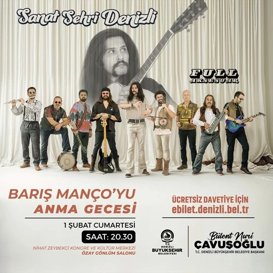 Denizlililer, Full Aksesuar grubunun sahne alacağı bu özel gecede, Barış Manço'nun unutulmaz eserlerini hep birlikte seslendirme fırsatı bulacak. Ücretsiz olarak gerçekleştirilecek etkinlik için davetiyeler ebilet.denizli.bel.tr adresinden temin edilecek. Anma konserine tüm vatandaşların davetli olduğu ifade edildi.