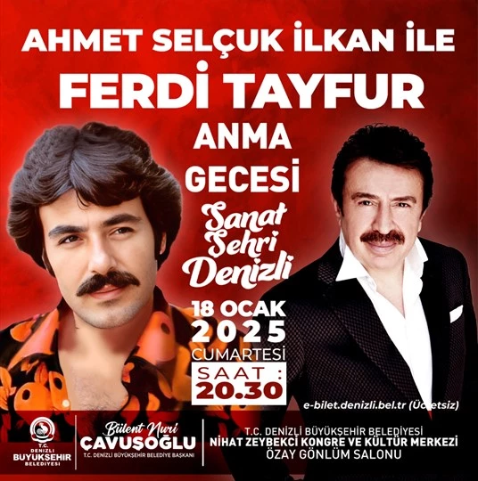 Denizli Büyükşehir Belediyesi, geçtiğimiz günlerde hayatını kaybeden ünlü şarkıcı Ferdi Tayfur için anma konseri düzenliyor. 18 Ocak Cumartesi günü unutulmaz şarkıların söz yazarı Ahmet Selçuk İlkan’ın da yer alacağı özel etkinliğe tüm vatandaşlar davet edildi.