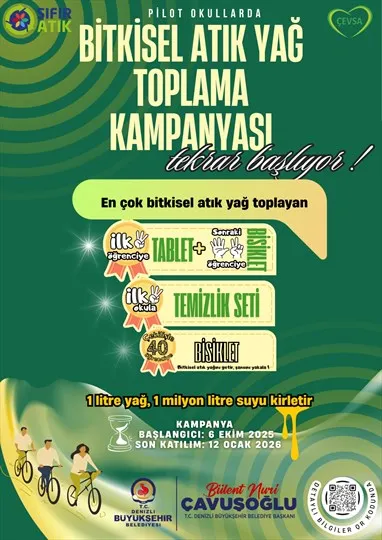 İklim Değişikliği ve Sıfır Atık Dairesi tarafından 2024-2025 eğitim-öğretim yılının ikinci döneminde 10 pilot okulda başlatılan uygulama, bu yıl daha da geliştirilerek 12 pilot okulda yapılacak. Merkezefendi ve Pamukkale ilçelerinde yürütülecek kampanya kapsamında öğrenciler, 6 Ekim 2025 – 12 Ocak 2026 tarihleri arasında bitkisel atık yağ toplayacak.