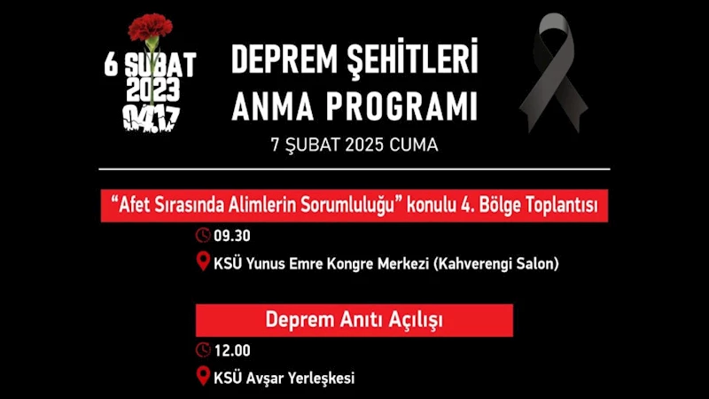 Deprem Şehitleri Anma Programı’nın son günü olan 7 Şubat Cuma günü KSÜ’de “Afet Sırasında Âlimlerin Sorumluluğu” konulu 4. Bölge Toplantısı ve Deprem Anıtı’nın açılışı gerçekleştirilecek. Programlara tüm vatandaşlar davet edildi.