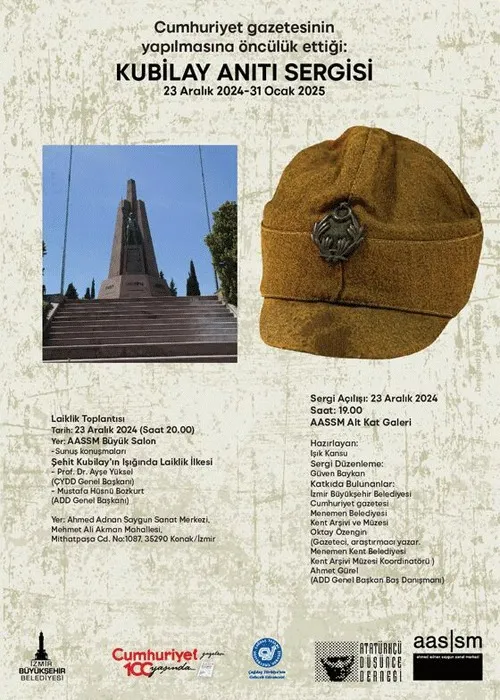 Işık Kansu’nun hazırladığı, küratörlüğünü Güven Baykan’ın yaptığı, İzmir Büyükşehir Belediyesi ve Cumhuriyet Gazetesi tarafından ortaklaşa düzenlenen Kubilay Anıtı Sergisi’ne, Menemen Belediyesi Kent Arşivi ve Müzesi, gazeteci, araştırmacı yazar ve Menemen Belediyesi Kent Arşivi Müzesi Koordinatörü Oktay Özengin ile Atatürkçü Düşünce Derneği (ADD) Genel Başkan Baş Danışmanı Ahmet Gürel katkıda bulundu. 23 Aralık günü saat 19.00’da açılacak sergi 31 Ocak 2025 tarihine kadar gezilebilecek. Ziyaret saatleri ise hafta içi ve cumartesi günleri 09.30-17.30, pazar günleri ise 12.00-17.00 olarak belirlendi. Sergi açılışının ardından yapılacak panel ise 23 Aralık günü saat 20.00’de başlayacak. Şehit Kubilay’ın Işığında Laiklik İlkesi adını taşıyan panelde, Çağdaş Yaşamı Destekleme Derneği (ÇYDD) Başkanı Prof. Dr. Ayşe Yüksel, ADD Genel Başkanı Mustafa Hüsnü Bozkurt ve Cumhuriyet Gazetesi’nin yöneticileri konuşma yapacak.
