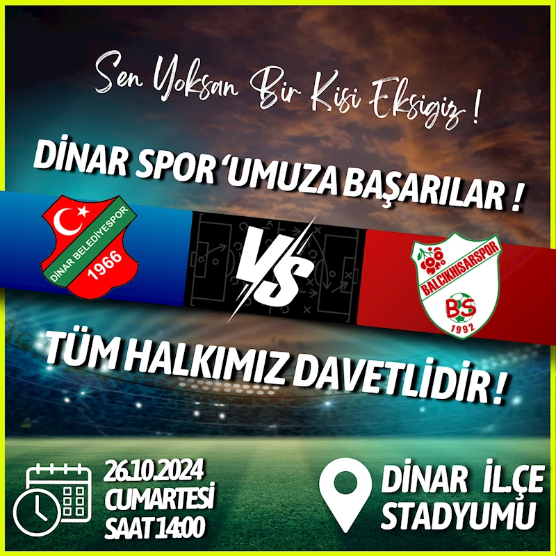 Dinar Belediye Sporumuz, 26 Ekim Cumartesi günü saat 14:00’te ilçemiz stadyumunda Balçıkhisar Belediye Spor ile 3. hafta karşılaşmasında karşı karşıya gelecek.