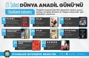Diyarbakır Büyükşehir Belediyesi, 21 Şubat Dünya Anadil Günü kapsamında film gösterimi, tiyatro, panel, konser, dengbêj dinletisi ve hikâye anlatıcılığı gibi çeşitli etkinlikler düzenleyecek.