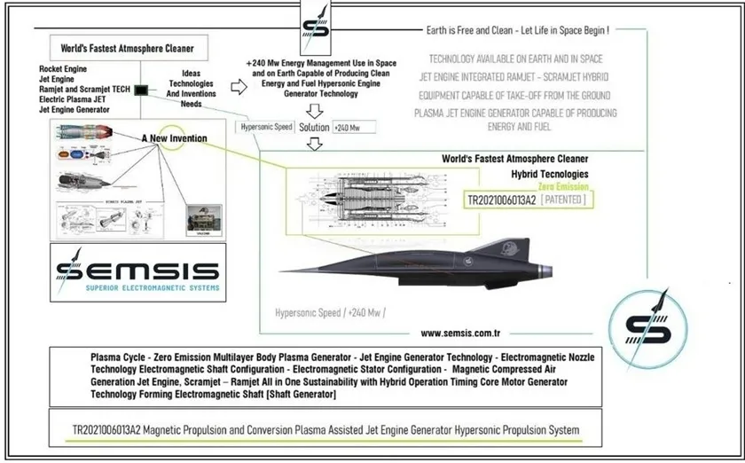 “Plazma Dönüşümlü Jet Motor Jeneratör İtki Sistemi” adı verilen bu teknoloji, klasik jet ve roket motorlarından köklü biçimde ayrılıyor. Geleneksel sistemlerin aksine yakıt depolarına ihtiyaç duymayan motor, atmosferdeki moleküllerden enerji hasadı yaparak çalışıyor.
