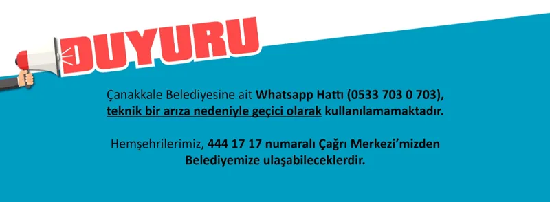 Çanakkale Belediyesine ait Whatsapp Hattı (0533 703 0 703), teknik bir arıza nedeniyle geçici olarak kullanılamamaktadır. Hemşehrilerimiz, 444 17 17 numaralı Çağrı Merkezi’mizden Belediyemize ulaşabileceklerdir.