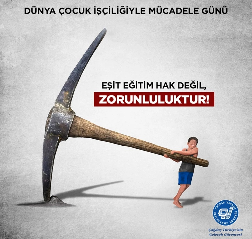 Çağdaş Yaşamı Destekleme Derneği olarak, 12 Haziran Dünya Çocuk İşçiliği İle Mücadele Günü’nde, Birleşmiş Milletler Çocuk Hakları Bildirgesi uyarınca 18 yaş altı tüm bireylerin çocuk olduğunu bir kez daha hatırlatıyor; çocuklarımızın eğitim hakkını savunmak ve çocuk işçiliğiyle mücadele etmek için var gücümüzle çalışıyoruz.