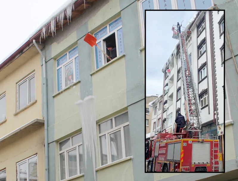 Kar kalınlığının 80 santimetreyi bulduğu ve sıcaklıkların gece eksi 15’lere kadar düştüğü şehrimizde, Belediyemiz bina saçaklarındaki tehlike oluşturan buz sarkıtlarını düşürme çalışması başlattı.