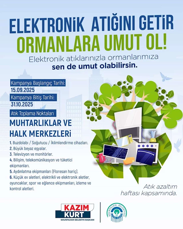 Odunpazarı Belediyesi, elektronik atıkların geri dönüşümüyle doğaya katkı sağlamak amacıyla yeni bir kampanya başlattı. “Elektronik Atığını Getir, Ormanlara Umut Ol!” sloganıyla hayata geçirilen proje kapsamında vatandaşlar, kullanmadıkları elektronik eşyaları muhtarlıklara ve halk merkezlerine teslim edebilecek.