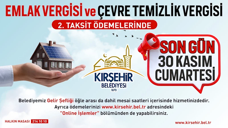 ödemelerinin 30 Kasım’da sona erecek olması nedeniyle Kırşehir Belediyesi Gelir Şefliği Vezneleri öğle araları da açık olacak.