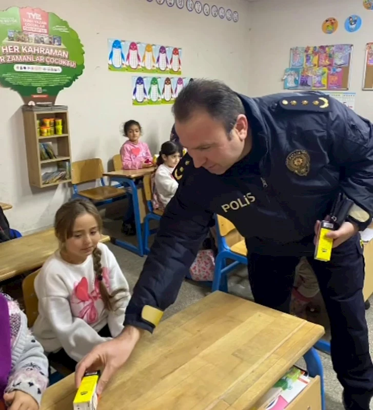 Erzurum’a bağlı Hınıs İlçe Emniyet Müdürlüğü personeli, Yolüstü İlkokulu ile Anaokulu öğrencilerini "Minik Kalplere Küçük Dokunuş" mottolu sosyal sorumluluk projesi kapsamında ziyaret etti. Yaklaşık 23 öğrenciye ikramların ardından çeşitli kırtasiye, spor malzemesi ve oyuncak dağıtımı yaptı. Polisler çocuklarla birlikte hazırlanan sinema ortamında "Rafadan Tayfa: Trafik" konulu öğretici çizgi film izledi ve keyifli vakitler geçirdi.