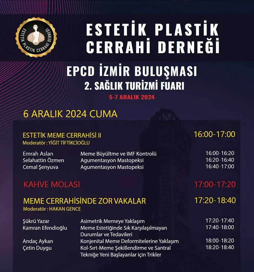 Estetik Plastik Cerrahi Derneği tarafından bir kongre de düzenlenecek. Kongre kapsamında, sağlık turizminin geleceğinden cerrahi uygulamalara kadar birçok konu ele alınacak. Onur konuğu olarak İzmir Büyükşehir Belediye Başkanı Sayın Cemil Tugay’ın da katılacağı bu özel günde siz değerli basın mensuplarını aramızda görmekten mutluluk duyarız.