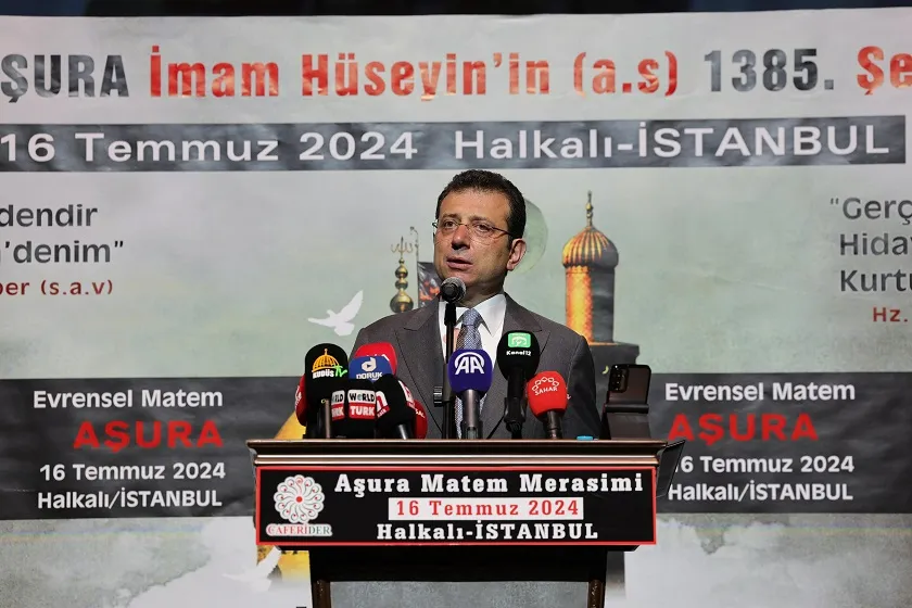 İBB olarak her inanç grubuna destek verildiğini vurgulayan İmamoğlu, “Her yıl burada Halkalı'da Caferi yurttaşlarımızca düzenlenen Aşura Matemi Merasimi’ni hem geçmişin acılarıyla yüzleşmek hem de bugünün zalimlerine karşı İmam Hüseyin ve Ehl-i Beyt’in cesur duruşunu hatırlamak, kendimize kılavuz etmek açısından çok kıymetli buluyor ve her yıl özenle takip ediyorum. Bugün manevi coğrafyamızın yapı taşlarından biri olan Caferi yurttaşlarımızın kendilerini asla ayrıştırılmış dışlanmış hissetmelerine yol açabilecek ne varsa ortadan kaldırmak da hepimizin asli görevidir. Biz İstanbul'umuzda bu konuda üzerimize düşen tüm görevleri en iyi şekilde yapma gayreti içerisindeyiz. Bunun hiçbir karşılığı yoktur. Bunun tek karşılığı bizim büyük sorumluluğumuzu yerine getirme gayretidir. İnanç masası çerçevesinde sunmaya gayret ettiğimiz bir kısım imkânlarla toplumumuzun her inanç mensubunun inancının ve öğretilerinin gereklerini özgür bir biçimde yerine getirmesini en güçlü şekilde destekliyoruz. Eksiğimiz var ise tamamlayacağız, desteklemeye devam edeceğiz” diye konuştu.