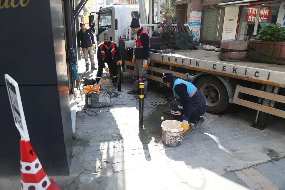 Ekipler, araç trafiğini olumsuz etkileyen usulsüz parklanmaların önüne geçmek için cadde ve sokak kenarlarına demir dubalar yerleştiriyor. Bu fiziki engellerle, yasa dışı park etmenin önü kesilmeye çalışılıyor.