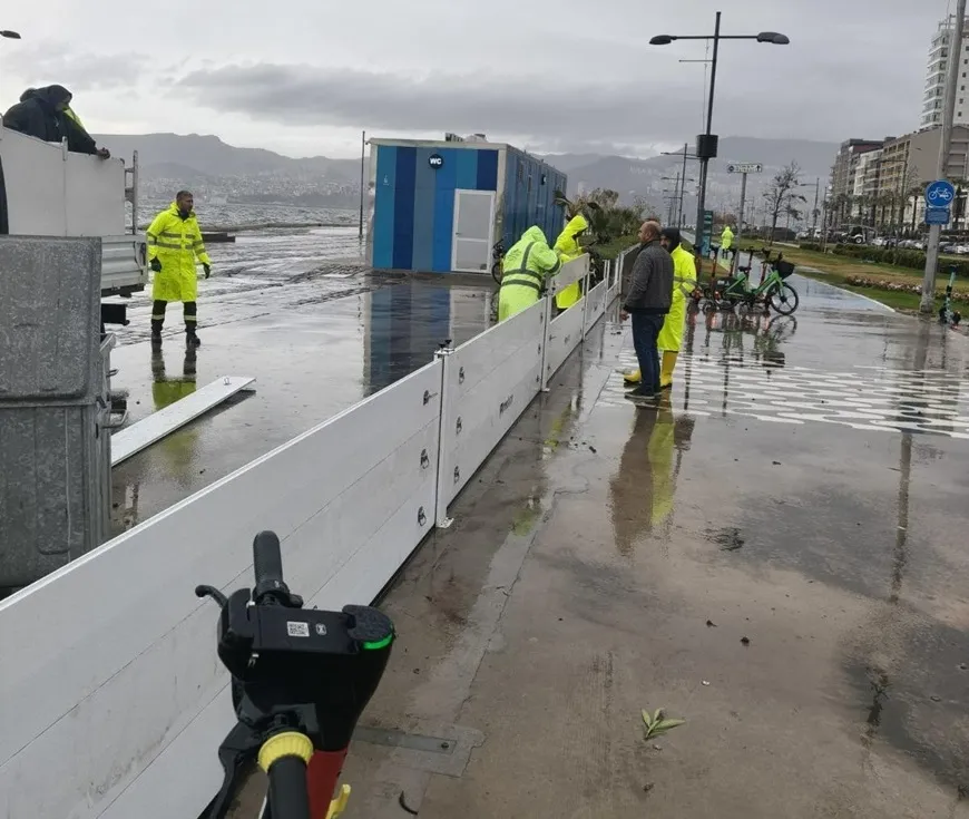 İzmir Büyükşehir Belediyesi tarafından Kordon’da inşa edilen geçici fırtına duvarı, sabah saatlerinde etkili olan sağanak yağış ve fırtınanın yol açabileceği deniz taşkınını engelledi. Hava koşullarının olumsuzlaşmasıyla birlikte Fen İşleri Dairesi Başkanlığı ekipleri, fırtına duvarının kapılarını aktif hale getirerek olası risklere karşı önlem aldı.