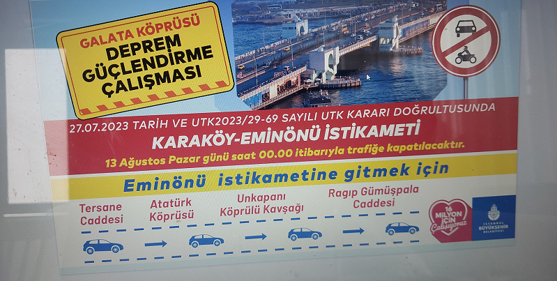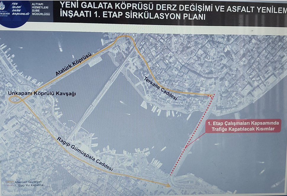 Çalışmalar kapsamında Galata Köprüsü’nde, birinci etapta Karaköy – Eminönü istikameti, ikinci etapta ise Eminönü - Karaköy istikameti trafiğe kapatılacak olup trafik akışı alternatif güzergâhlar ile sağlanacak.