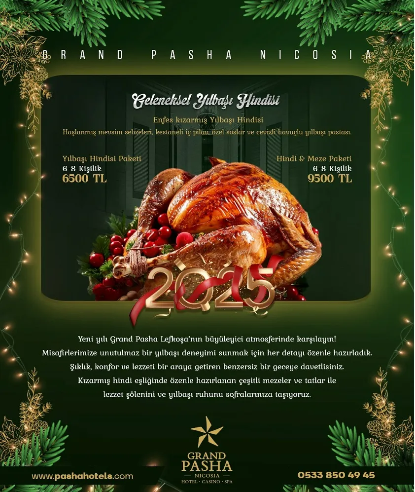 Lüks konaklama ayrıcalıklarının yanı sıra misafirlerine kusursuz bir yılbaşı gecesi sunan Grand Pasha Lefkoşa, Geleneksel Yılbaşı Hindisi ve Hindi & Meze menüleri ile geceye eşlik ediyor. Geleneksel Yılbaşı Hindisi menüsü, özenle kızartılmış enfes hindinin yanı sıra haşlanmış mevsim sebzeleri, kestaneli iç pilav ve yılbaşı pastası ile taçlanıyor.