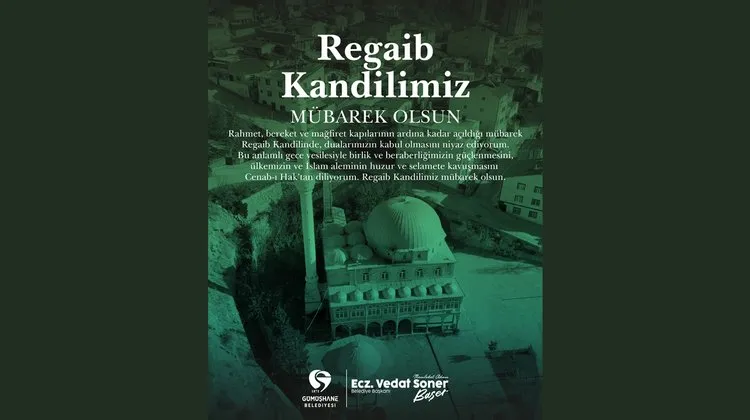 25 Aralık 2025, Perşembe Gümüşhane Belediye Başkanı, Regaib Kandili dolayısıyla bir mesaj yayımladı. Mesajında, mübarek gecenin tüm Gümüşhaneliler ve İslam âlemi için hayırlara, birlik ve beraberliğe vesile olmasını temenni etti. Gümüşhane,Gümüşhane Belediyesibelediye365.com