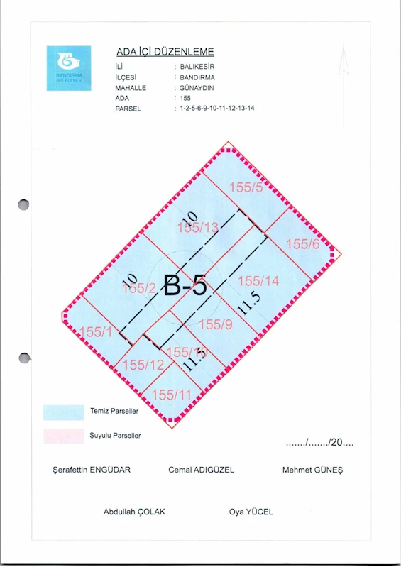 Belediye Encümeninin 18.06.2025 tarih ve 561 sayılı Encümen kararı ile, Günaydın Mahallesi, 155 ada 1-2-5-6-9-10-11-12-13-14 nolu parsellere ait ada içi düzenlemesinin, 1/1000 ölçekli Bandırma Uygulama İmar Planı notlarının 137. Maddesi ve 3194 sayılı İmar Kanununun 19. maddesi gereği onaylanmasına,