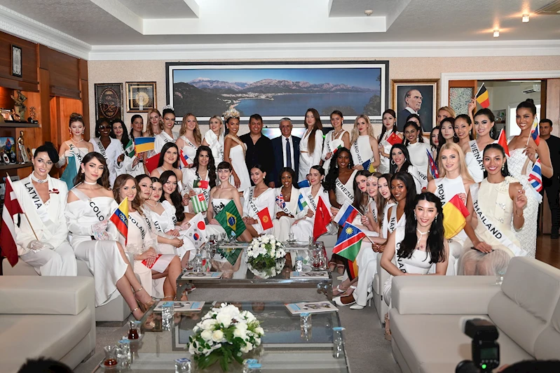 Kemer'de bu yıl 19'uncusu düzenlenen Miss Aura International Güzellik yarışması için Kemer'de bulunan 43 ülkeden güzeller yarışmanın organizatörü Adnan Şeker'le birlikte Kemer Belediye Başkanı Necati Topaloğlu'nu makamında ziyaret etti.
