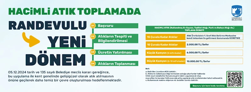 Hacimli atıklarını atmak isteyen hemşehrilerimizin; Çanakkale Belediyesi İletişim Masalarına veya Temizlik İşleri Müdürlüğüne dilekçe ile başvuruda bulunması ya da görselde bulunan karekodu okutarak açılan sayfadaki başvuru formunu doldurarak randevu alması gerekmektedir. Başvurunun ardından oluşturulan randevu ile ekipler atıkların tespitini yaparak, atıkların hacmi konusunda bilgilendirmede bulunacaktır. Tespit işlemi sonucunda çıkan hacim durumuna göre belirlenen ücretin ödenmesi sonrasında ise belediye ekiplerince atıklar toplanacaktır.