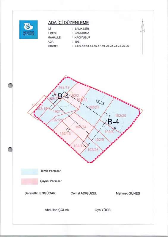 Bandırma Belediyesi Encümeni'nin 12.11.2025 tarih ve 1238 sayılı kararıyla, Hacıyusuf Mahallesi 192 ada içinde yer alan 2, 8, 9, 12, 13, 14, 15, 17, 19, 20, 22, 23, 24, 25 ve 26 numaralı parsellere ait ada içi düzenlemesinin onaylanmasına karar verildi.