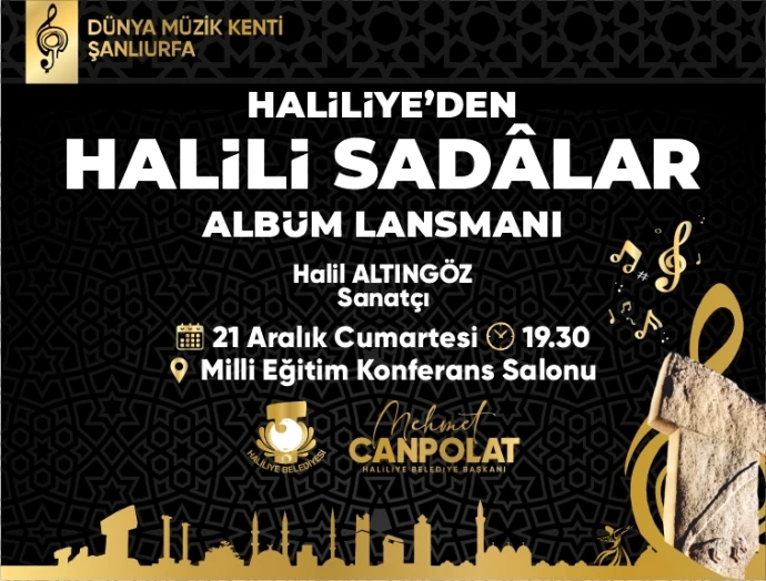 21 Aralık Cumartesi günü Şanlıurfa İl Milli Eğitim Konferans Salonunda 19.30’da başlayacak olan “Haliliye’den Halili Sadâlar” konserine tüm vatandaşları davet eden Haliliye Belediye Başkanı Mehmet Canpolat, “Duyguların ses ve müzikle birleştiği, yaşanmışlıkların ve tecrübelerin türkülerle harmanlandığı Müzik Şehri Şanlıurfa’mızın musiki hazinesini zenginleştiren eşsiz türküleri dinlemek için tüm hemşehrilerimizi, Haliliye’den Halili Sadalar albüm lansmanı, konserine bekliyoruz” dedi.