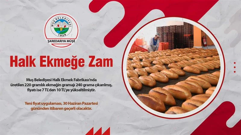 Artan maliyetler nedeniyle Halk Ekmek Fabrikamızda üretimi yapılan 220 Gr ekmek, 240 Gr. yükseltilerek 7₺ den 10₺ ye satışa sunulacak.