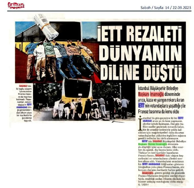 1950'lerden günümüze NATO ilişkilerinin ve siyasi gelişmelerin irdelendiği yazıyı Sabah ve A Haber “İETT Fransız Basınında” diyerek paylaştı. Yazının gerçek içeriğine hiç değinmeyerek okuyucularını ve Türk halkını kandırmaya çalıştı. Makalede İETT ve İstanbul kelimesi dahi geçmemesine rağmen iftira fırsatı olarak kullandı.