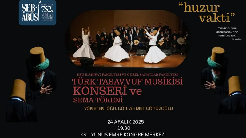 Musiki konserinde tasavvufun seçkin eserleri seslendirilecek. Semazenler ise izleyicilere maneviyat dolu anlar yaşatacak. Etkinlik, Hz. Mevlânâ'nın evrensel mesajlarını hatırlatma ve paylaşma amacını taşıyor.
