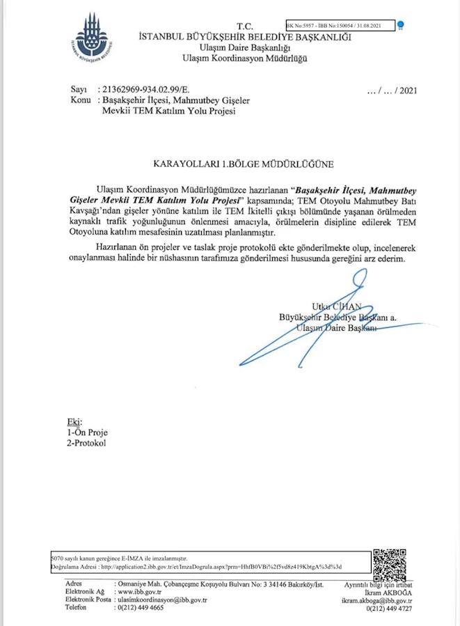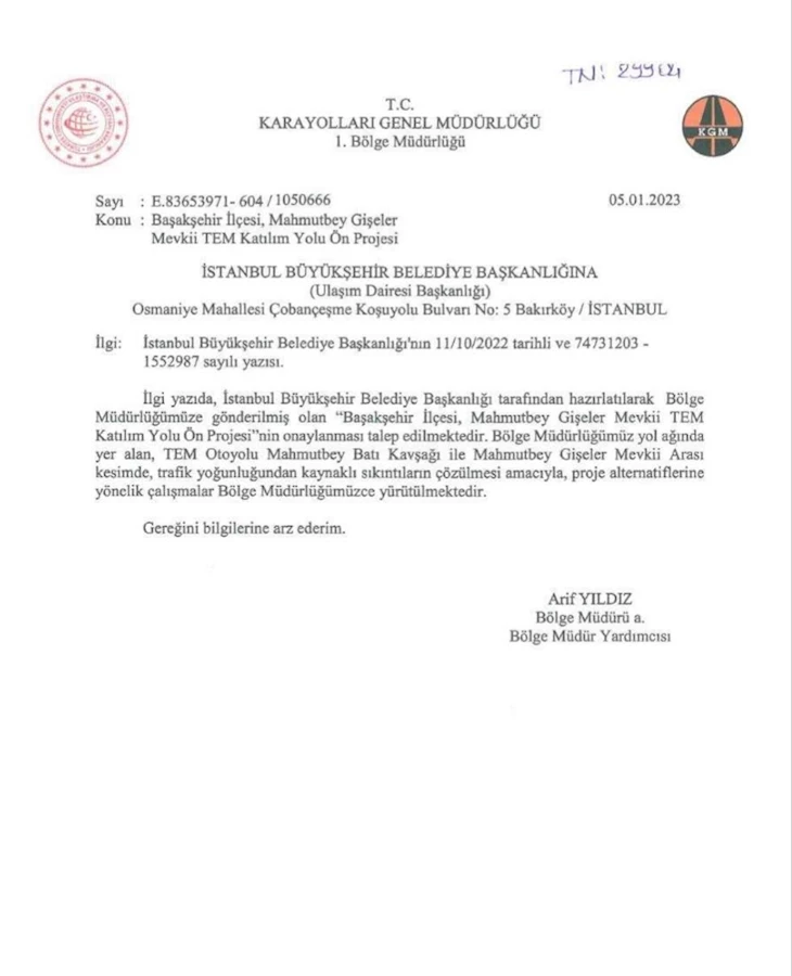 KGM 1. Bölge Müdürlüğü tarafından Bölge Müdür Yardımcısı Arif Yıldız imzasıyla İBB’ye gönderilen yazıda, “İBB tarafından hatırlatılarak bölge müdürlüğümüze gönderilmiş olan Başakşehir İlçesi Mahmutbey Gişeler Mevkii TEM Katılım Yolu Ön Projesi’nin onaylanması talep edilmektedir. Bölge müdürlüğümüzün yol ağında yer alan TEM otoyolu Mahmutbey Batı kavşağı ile Mahmutbey Gişeler arası kesimde, trafik yoğunluğundan kaynaklı sıkıntıların çözülmesi amacıyla proje alternatiflerine yönelik çalışmalar, bölge müdürlüğümüzde yürütülmektedir” denildi.
