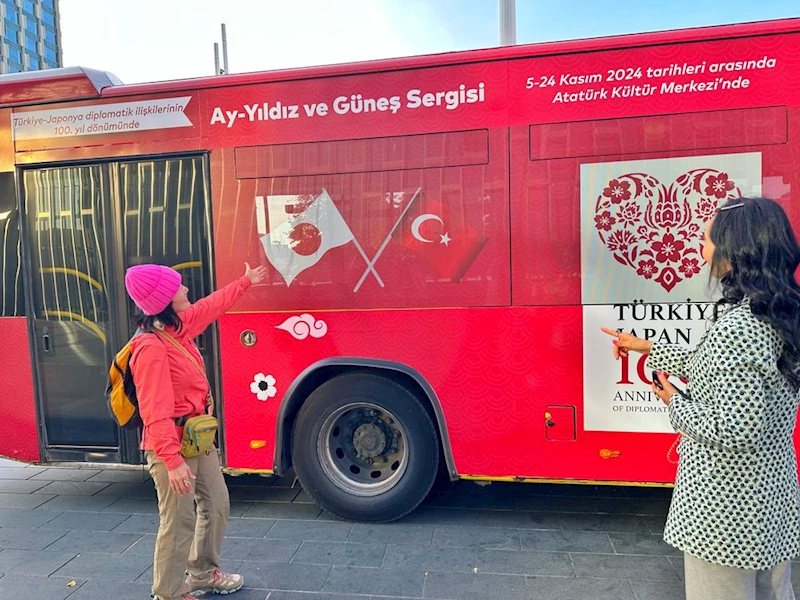 Otobüste; Türkiye ve Japonya bayrakları, diplomatik ilişkilerin100.yılına özel hazırlanan logo ve 100.yıl için İstanbul Atatürk Kültür Merkezi’nde 5-24 Kasım 2024 tarihlerinde ücretsiz olarak gezilebilecek serginin de bilgileri yer alıyor.