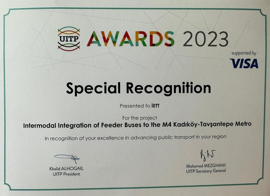 İETT, “M4 Kadıköy – Sabiha Gökçen Havalimanı Metrosu ile İETT Otobüs Hatları Entegrasyonu” isimli projesiyle UITP Özel Ödülü’nü aldı. 2023 yılında Türkiye’den ödül alan tek toplu ulaşım kurumu da İETT oldu.
