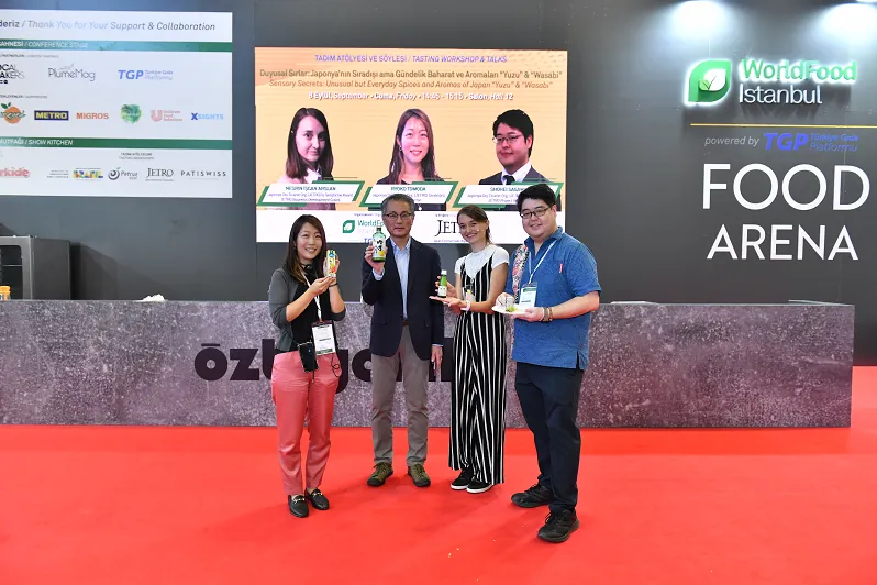 Nesrin İşcan Arslan “Yuzu, Japon mutfağında kullanılan bir tatlandırıcıdır. Özellikle sashimi, noodle, ve bazı ızgara balıklar üzerinde rende halinde sunum gerçekleştiriliyor. Maalesef Türkiye’de bu ihrac edilmiyor, bir ithalatçı yok. Wasabi çok pahalı bir sebze, herkesin ulaşabileceği bir ürün değil. En çok kullanılan ürünü toz wasabi, marketlerde en çok satan ürünü ise tüp şeklinde. Türkiye’de wasabi var fakat içinde gerçek wasabi yer almıyor. Wasabi peynir ürünlerinde de kullanılıyor, et ile tüketiliyor. Wasabinin istediği toprak çakıllı ve kumlu olmalı, suyu hızlı absorbe olmalı. Japanstreet diye bir platformumuz var, bu platform üzerinden japon şirketlerine ulaşabiliyorsunuz. Burada sadece yuzu ve wasabi yok, gıdadan tutun, kozmetik makina alanında birçok sektörde japon üreticilerin mevcut olduğu bir platform. Bu fuara katılma sebebimiz bu platformu tanıtmak ve bu ürünleri ithal edebilecek şirketlerle bağlantı kurabilmek. Ramen Türkiye’de pek tercih edilmiyor. Bu şekilde çorba gibi, su içinde olunca tüketmekte zorlanıyor olabiliriz. Japonya’da bunu tüketirken ses çıkartılır, bizim kültürümüzde yok ama, Japonya’da bu ses lezzetli olduğunu göstermek içindir.” sözleriyle Japon lezzetlerinin inceliklerini paylaşırken, Ryoko Tomoda ve Shohei Sagawa yuzuları dağıtarak, enfes rameniyle ziyafet yaşattı.