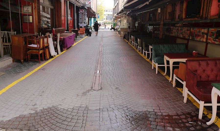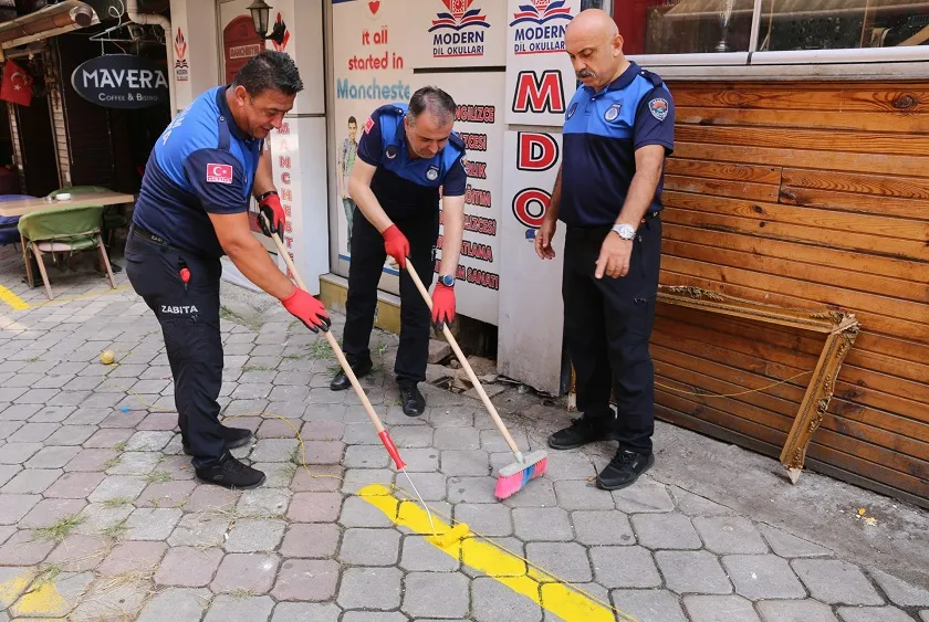 SAMSUN-İlkadım Belediyesi ekipleri, ilçede faaliyet gösteren kafe ve restoranların, 110 santimetre olarak belirlenen işgal sınır çizgisini, boya ile belirginleştirdi.